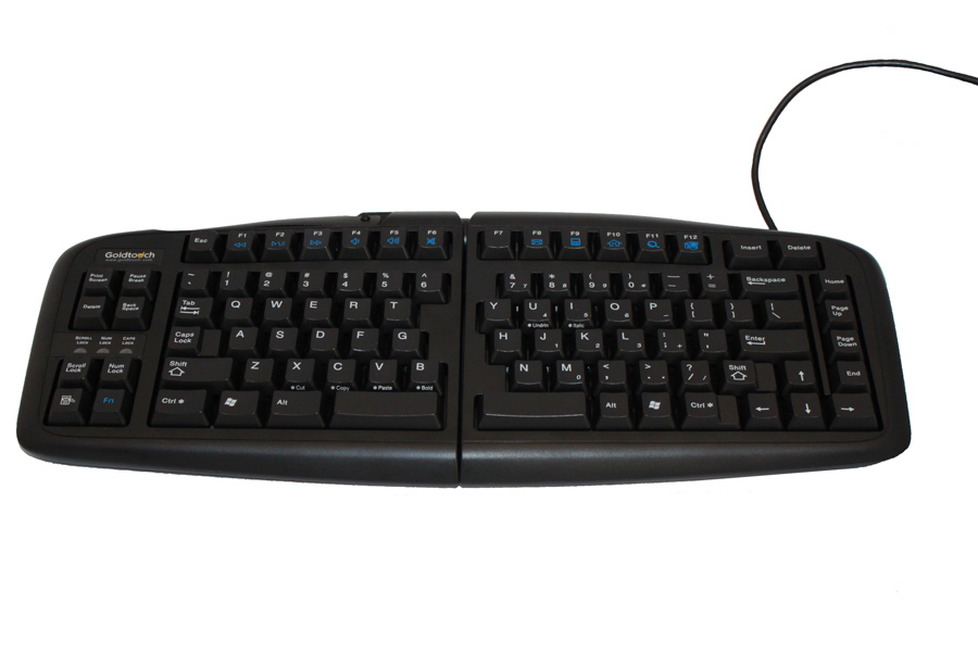 Die Goldtouch Adjustable V2 ist in der Breite und Höhe 0 – 30° verstellbar. Hände, Handgelenke und Arme können in einer natürlicheren Haltung (also entspannter) bleiben als bei traditionellen Tastaturen. Mit dieser Tastatur erhöht sich der Arbeitskomfort, und nach einer gewissen Gewöhnung auch die Produktivität. Die Funktionstasten befinden sich auf der linken Seite, so das die Maus dichter an der Tastatur benutzt werden kann.