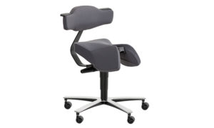 Ein Sattelstuhl mit Kippfunktion, der ein hohes Maß an Komfort mit vielen Variationsmöglichkeiten bietet. Er ist mit einer „Rückenlehne“ ausgestattet, die sich 360 Grad um den Sitz drehen lässt.
